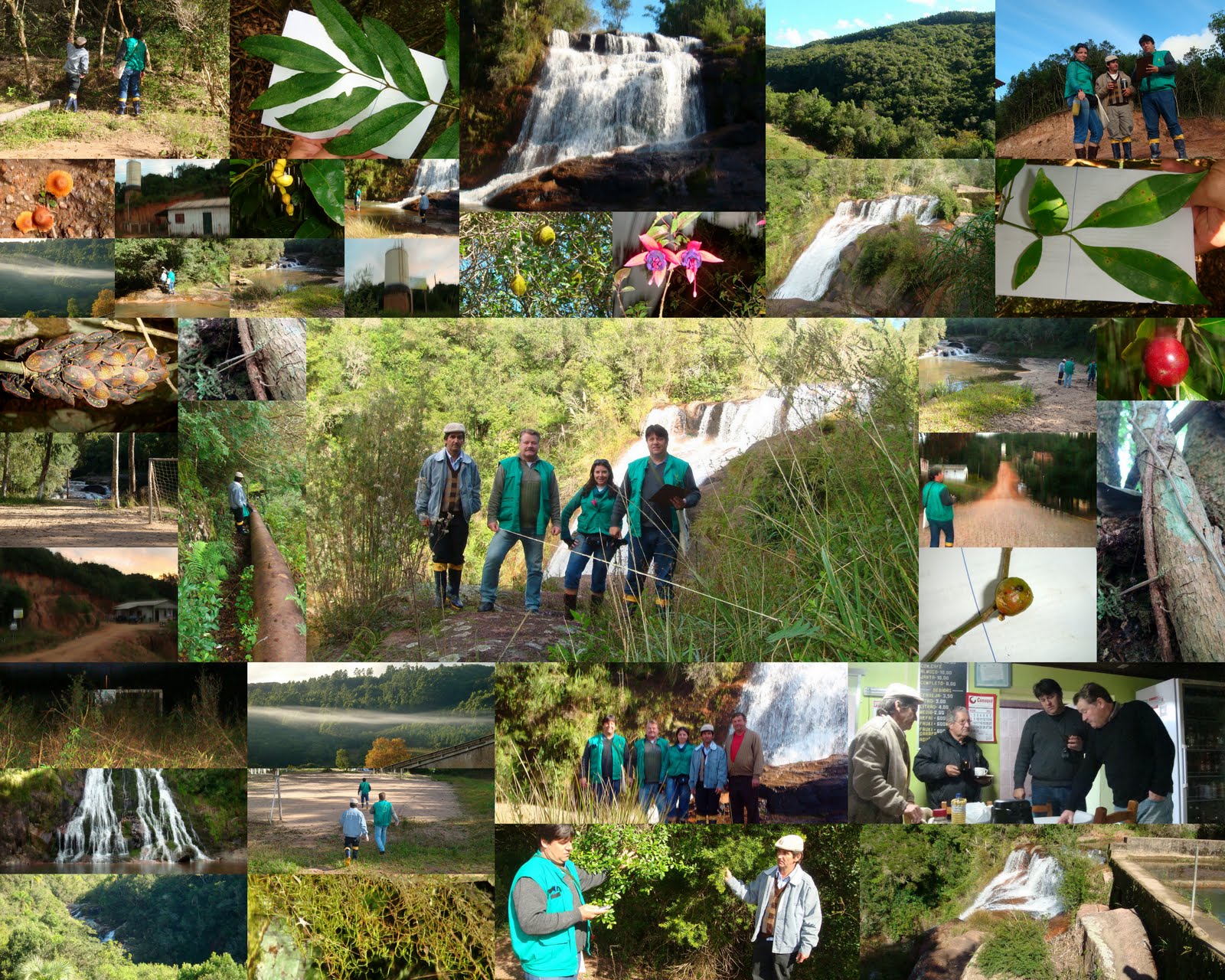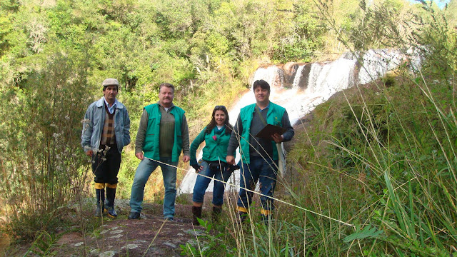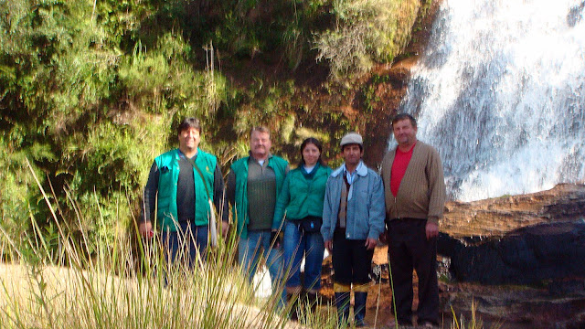 Equipe na cascata do Armando Solca – Biólogos, Geólogo e Agricultor.